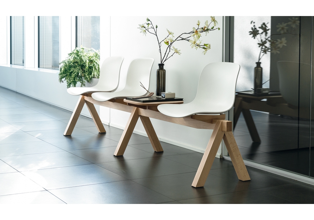 Troy conçu par Marcel Wanders pour Magis est un système de sièges avec assise en polypropylène et barre en hêtre massif. Disponible en différentes finitions et compositions.