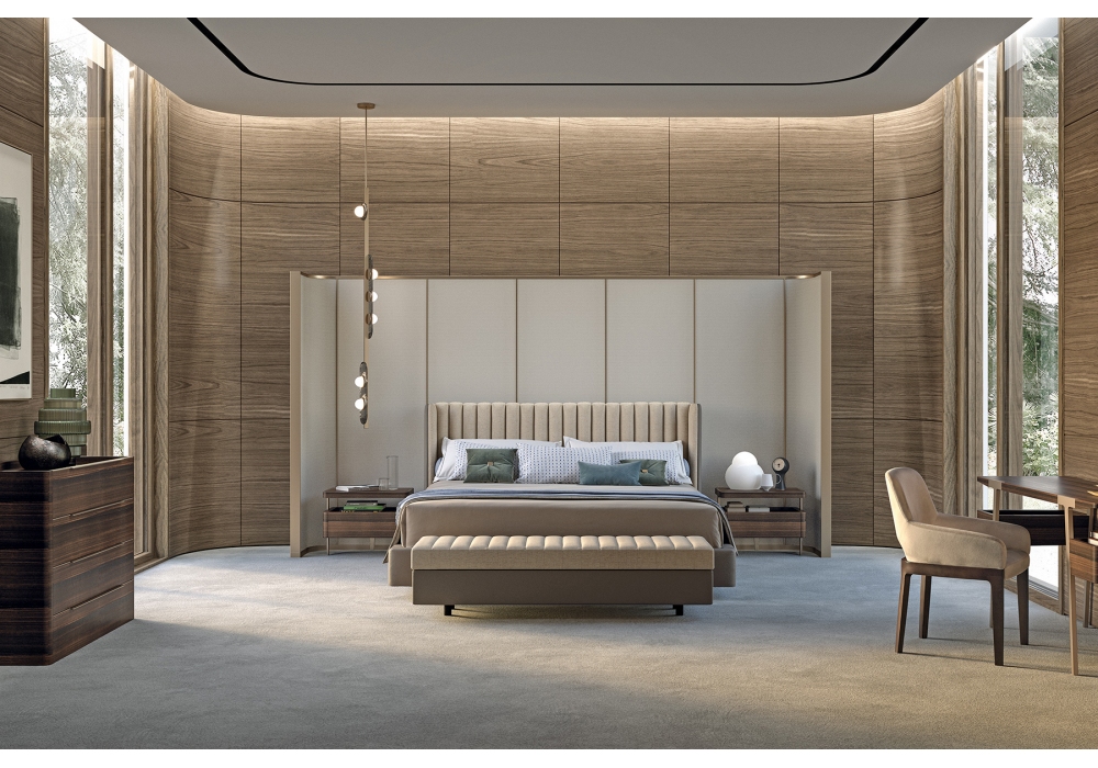 Domus conçu par Matteo Nunziati pour Turri est un banquette avec structure en MDF et contreplaqué. Rembourrage en mousse de polyuréthane multi-densité et ouate de polyester et revêtement en différents cuirs ou tissus inamovibles.