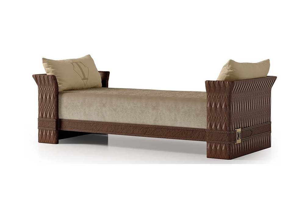 Numero Tre conçu par Roberto Serio pour Turri est un banquette avec structure en contreplaqué et bois massif rembourré en mousse de polyuréthane multi-densité avec structure revêtue en différents cuirs. Garnissage cuir ou tissu et détails en métal doré.