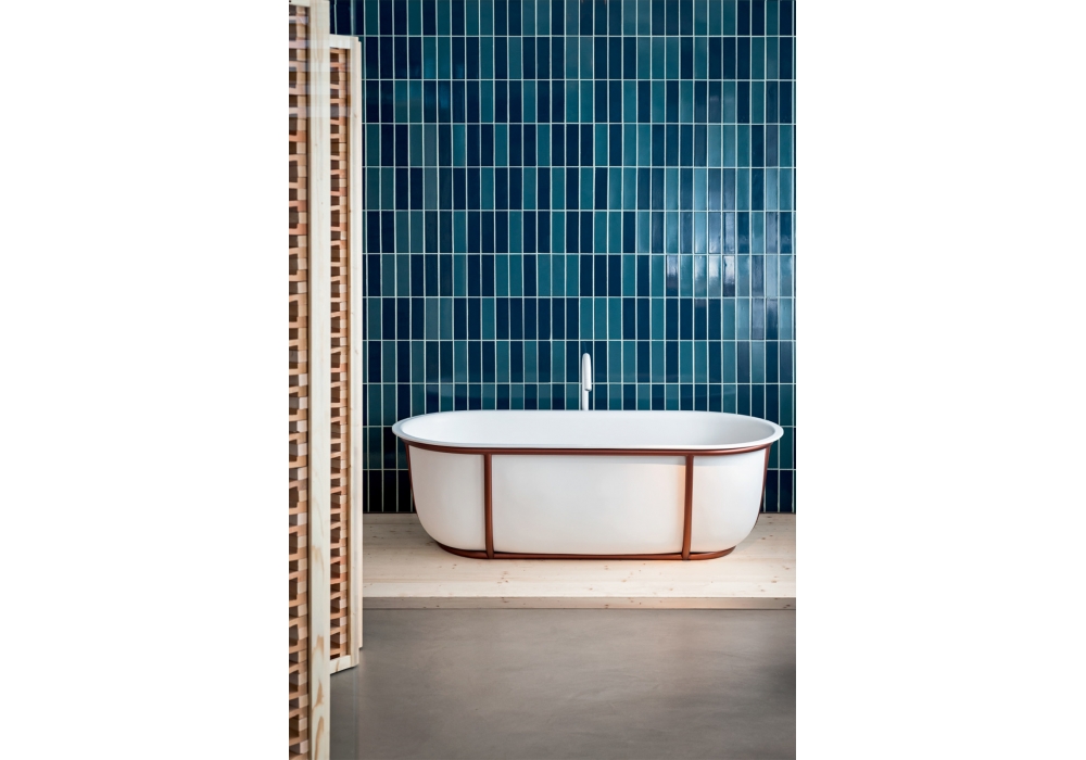 Cuna conçue par Patricia Urquiola pour Agape est une baignoire en solid surface blanc ou bicolore avec structure portante en tube d'acier inoxydable peint en différentes finitions ou brossé bruni. La baignoire est équipée d'un siphon chromé avec système de trop-plein intégré. Il n'y a pas de trous pour les robinets ; qui peut être placé au mur ou au sol.