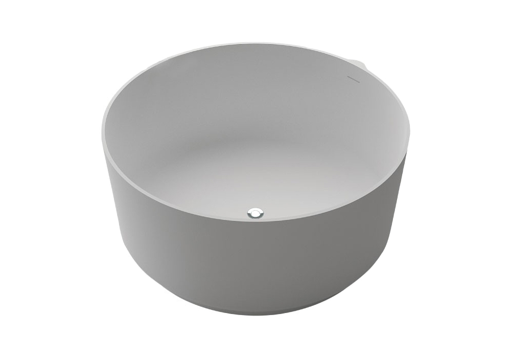 In-Out conçue par Benedini Associati pour Agape est une baignoire avec une base ronde en solid surface blanche ou bicolore. L'utilisation d'une évacuation siphonnée est obligatoire. Les robinets peuvent être placés au mur ou au sol.