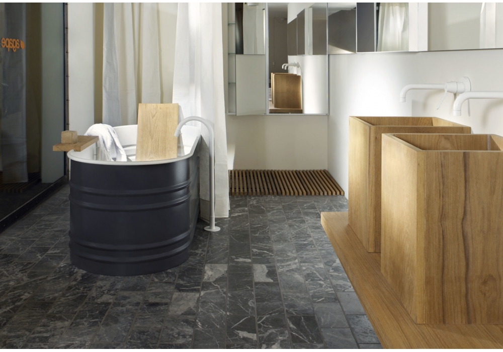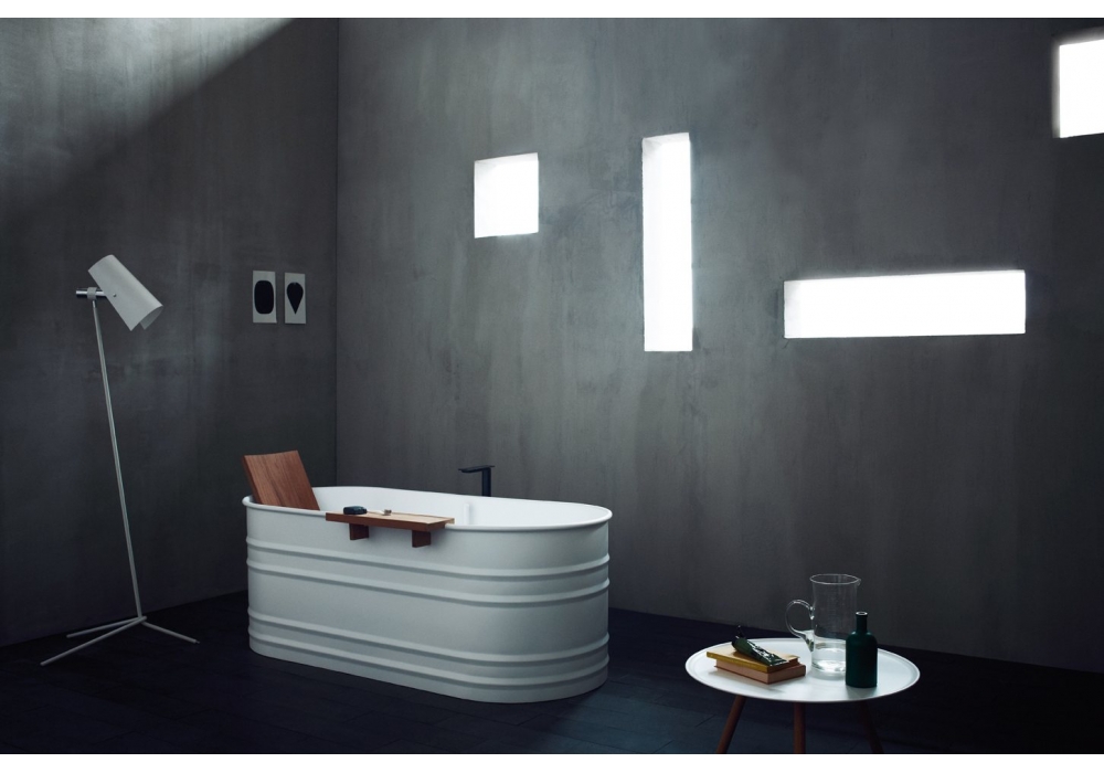 Vieques conçue par Patricia Urquiola pour Agape est une baignoire ovale en acier peint en blanc ou avec un extérieur gris foncé ou gris clair ; avec circuit de trop-plein extérieur blanc. Disponible en deux tailles et dans la version avec ou sans dossier en iroko. Sur demande, il est possible d'ajouter une étagère de rangement en iroko.