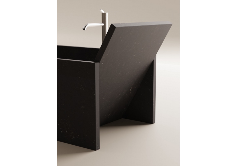 Face à face conçue par Jean Nouvel pour Agape est une baignoire réalisée avec des plaques de marbre disponibles en différentes finitions. Elle ne comporte aucun trou pour la robinetterie, qui peut être placée au sol ou au mur.