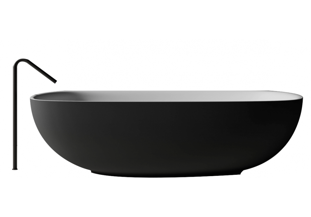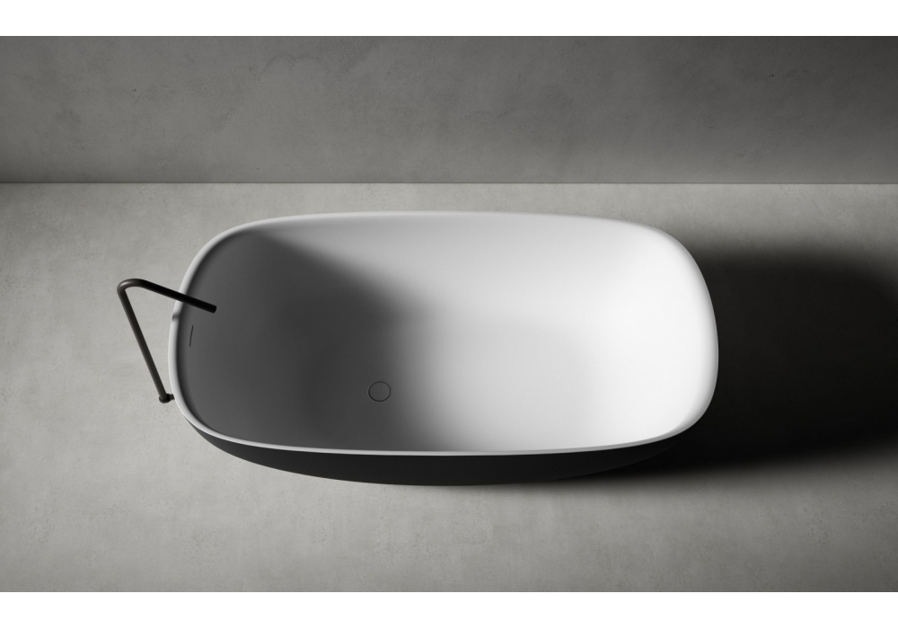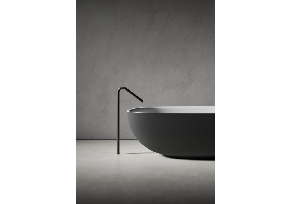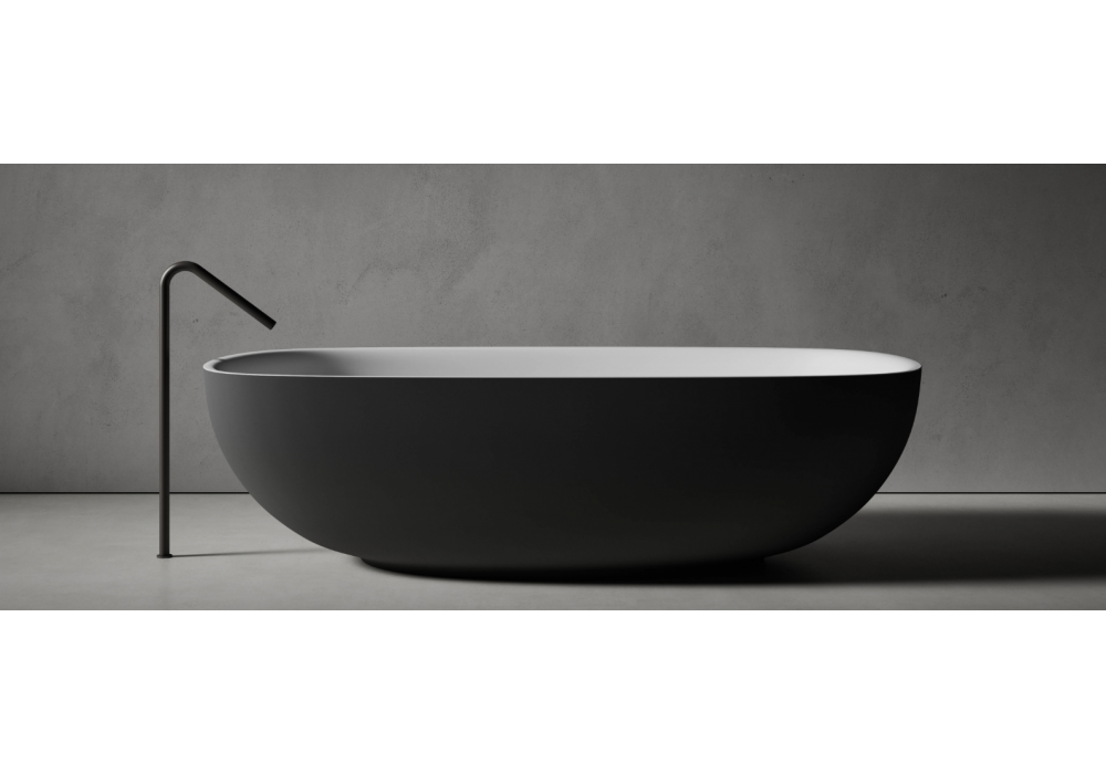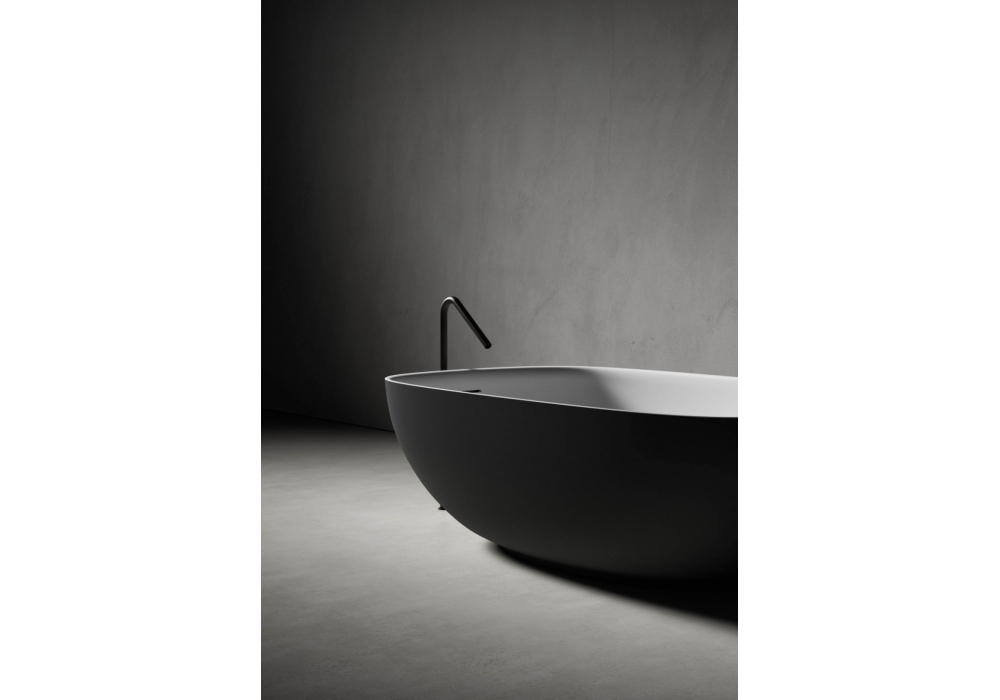 Faroe conçue par Piero Lissoni est une baignoire îlot monobloc, en Cristalplant® blanc ou avec revêtement extérieur en peinture gris anthracite Soft Touch.