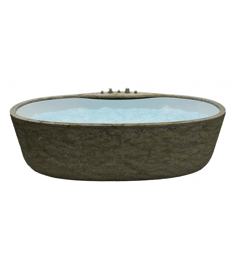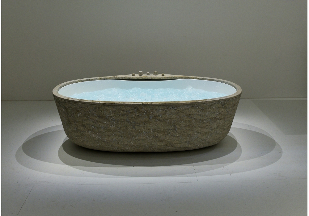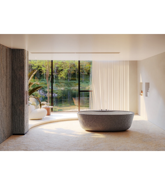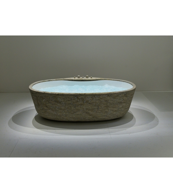 Pearl conçue par Alberto Apostoli pour Kreoo est une baignoire d'hydromassage en marbre. L'extérieur en matériau de forme irrégulière est fabriqué dans une finition vert olive, tandis que l'intérieur est lisse, dans une finition brillante transparente.