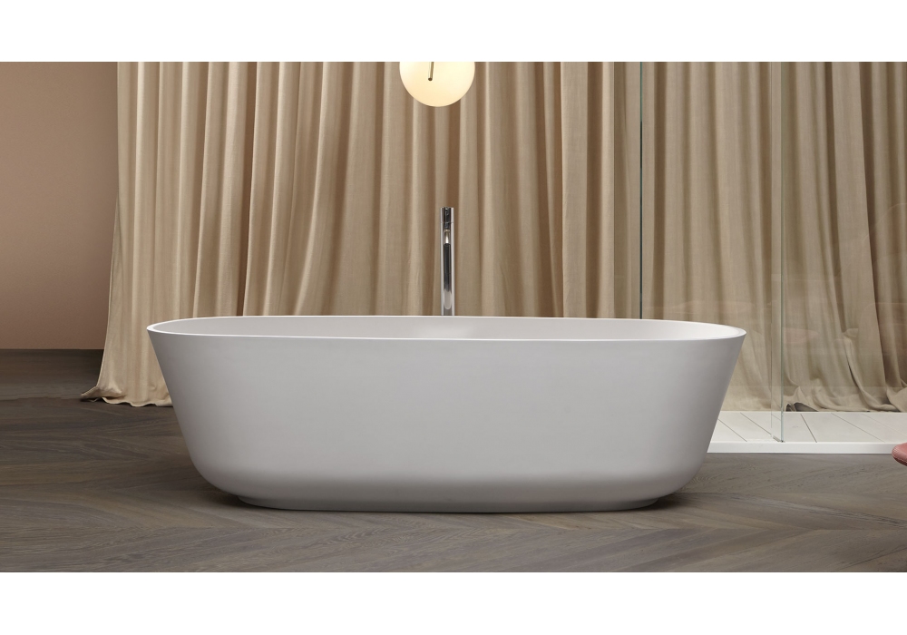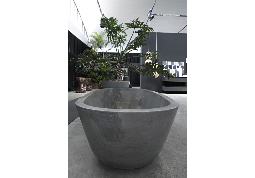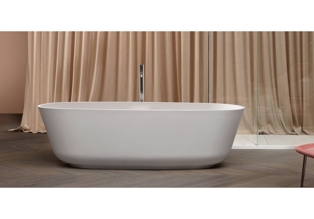 Baìa conçue par Carlo Colombo pour Antonio Lupi est une baignoire ovale en Cristalplant ou en pierre, pouvant être peinte à l'extérieur, équipée d'un drain avec système de drainage à pression click-clack, d'un siphon et d'un tuyau flexible.