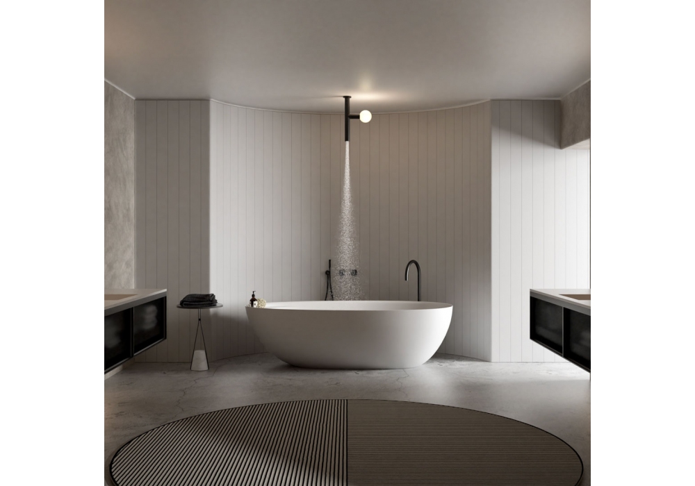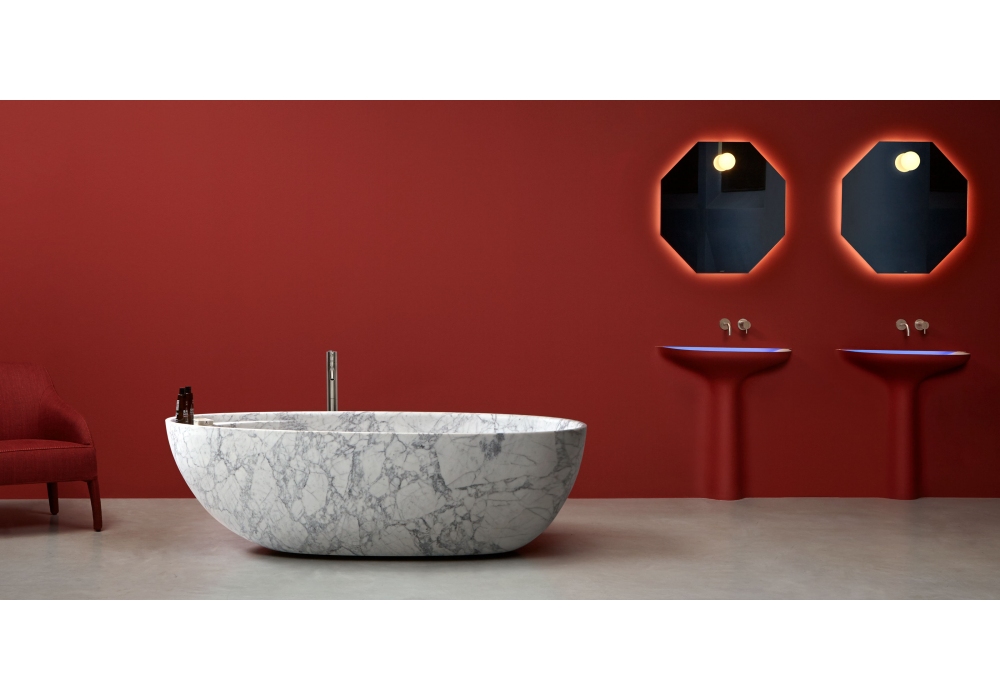 Eclipse conçue par Marco Di Paolo pour Antonio Lupi est une baignoire ovale en pierre ou en Cristalplant, pouvant être peinte à l'extérieur, équipée d'un drain avec système de drainage à pression click-clack, d'un siphon et d'un tuyau flexible.
