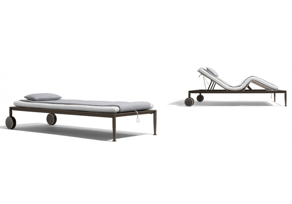 Gea conçu par Chi Wing Lo pour Giorgetti est un bain de soleil inclinable avec roues avec structure en acier inoxydable protégé peinte en poudre caroube. Plateau en contreplaqué de bouleau et placage de chêne Abonos. Rembourrage in Breathair®. Réglable dans 4 différentes positions d'inclinaison pour le dossier et 3 pour le repose-pieds. Matelas for lit réversible avec appuie-tête inclus. Revêtement complètement démontable.