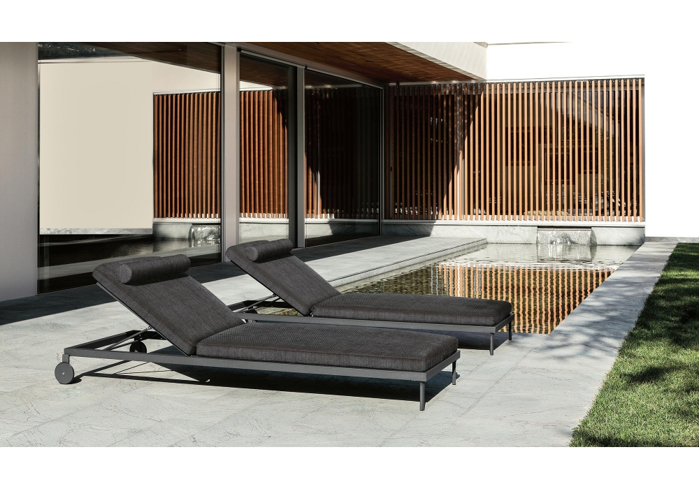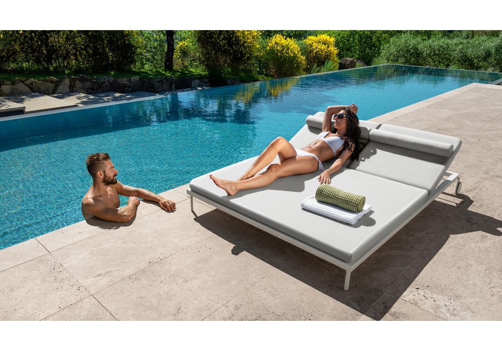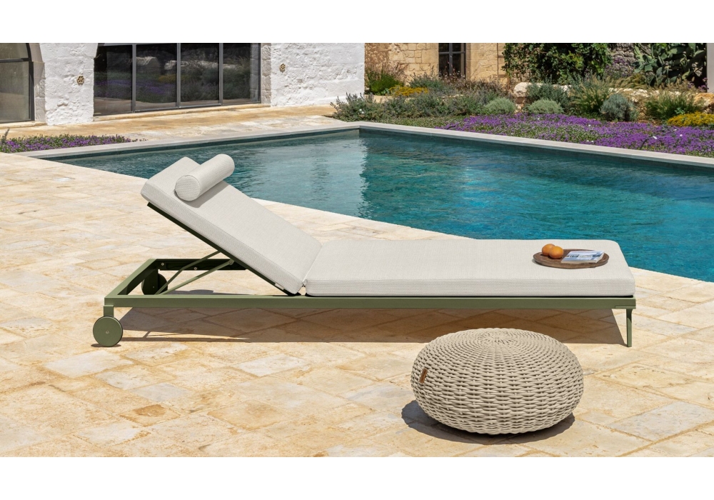 Cleo Soft Alu conçu par Marco Acerbis pour Talenti est un transat d'extérieur avec une structure et un revêtement en tissu blanc, graphite ou vert. Disponible en deux versions simple et double.