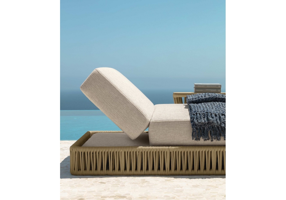 Cliff est un transat par Ludovica et Roberto Palomba pour Talenti. La chaise longue Cliff a une structure tubulaire recouverte de corde synthétique tissée et de coussins en tissu amovibles avec un rembourrage en mousse sèche. La corde synthétique est un matériau consistant en une double tresse construite avec une âme en polyester et un revêtement de propylène multifilamentaire. La fibre externe qui le compose est imperméable et résistante aux rayons UV.