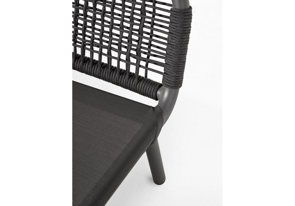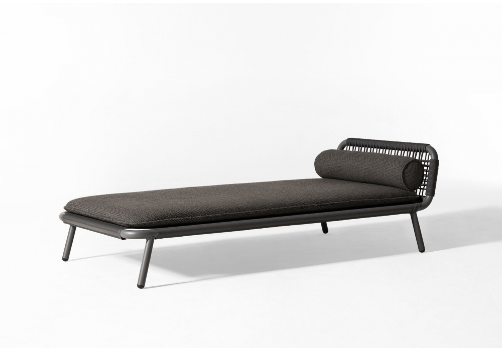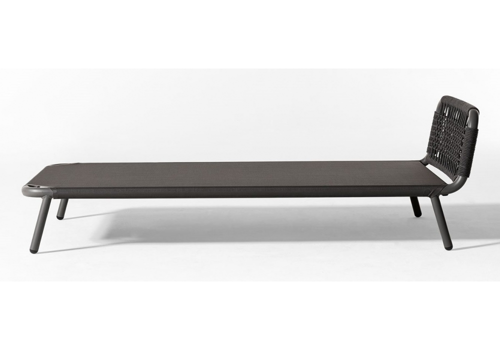 Noa UNO Open Air conçu par Andrea Parisio pour Meridiani est un bain de soleil d'extérieur avec structure en aluminium peint, assise en tissu Batyline et dossier tressé en corde. Divers accessoires disponibles pour améliorer votre confort.