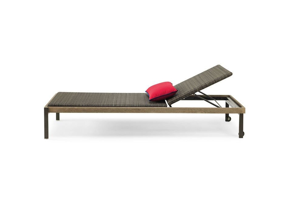 Allaperto Mountain conçu par Matteo Thun, Antonio Rodriguez pour Ethimo est un lit de bronzage en bois de teck décapé avec revêtement en fibre etwick. Le matelas est recouvert d'un tissu acrylique hydrofuge de couleur expresso.