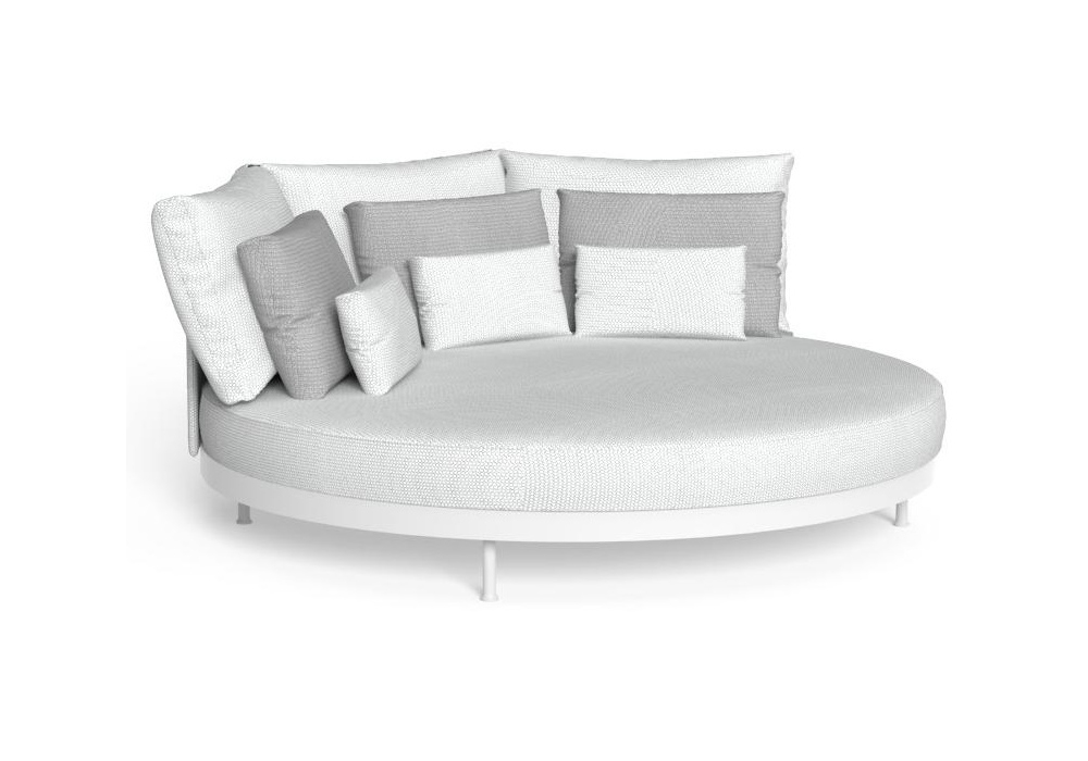 Slam conçu par Ludovica + Roberto Palomba pour Talenti est un lit de repos circulaire avec structure en aluminium thermolaqué disponible en deux couleurs. Le dossier et le coussin sont déhoussables et recouverts de tissus d'extérieur résistants aux intempéries.