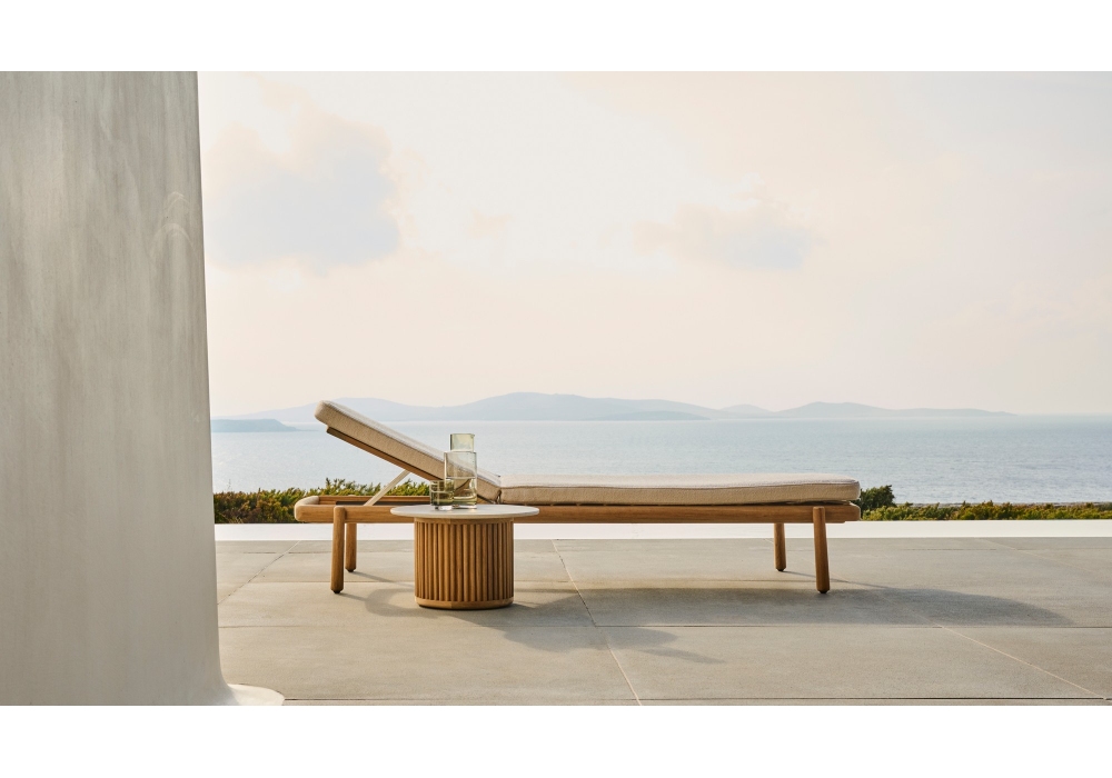 Ukiyo conçu par Monica Armani pour Tribù est un bain de soleil avec structure en teck et assise rembourrée, revêtue en différentes finitions.