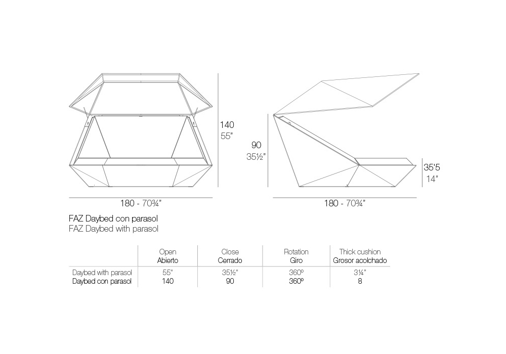 Faz conçue par Ramón Esteve pour Vondom est une daybed avec pare-soleil réalisée en résine de polyéthylène rotomoulé et revêtement en tissu. 100% recyclable. Convient pour une utilisation intérieure et extérieure. Disponible en différentes finitions.