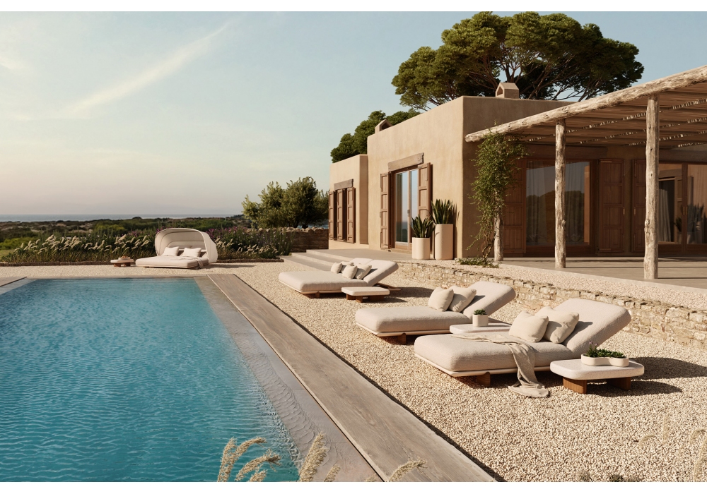 Milos conçu par Jean Marie Massaud pour Vondom est un bain de soleil réalisé avec un rembourrage en mousse de polyuréthane, des pieds en bois d'iroko et un revêtement en tissu. Structure en aluminium laqué.