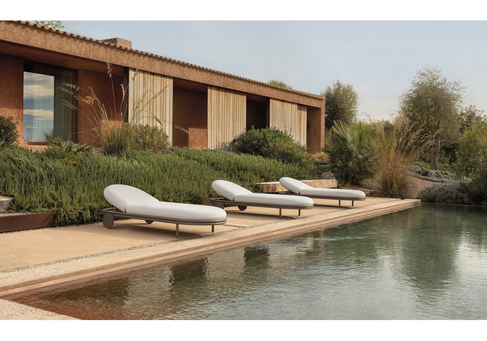 Cask conçue par Norm Architects pour Expormim, est une chaise longue à roulettes, fabriquée en aluminium, avec des coussins rembourrés et recouverts de tissu. Disponible en différentes finitions.