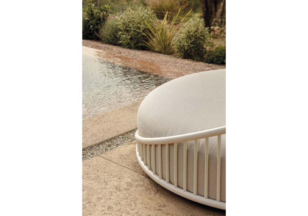 Cask conçu par Norm Architects pour Expormim, est un lit de repos rond en aluminium, avec coussins rembourrés et recouverts de tissu. Disponible en différentes finitions.