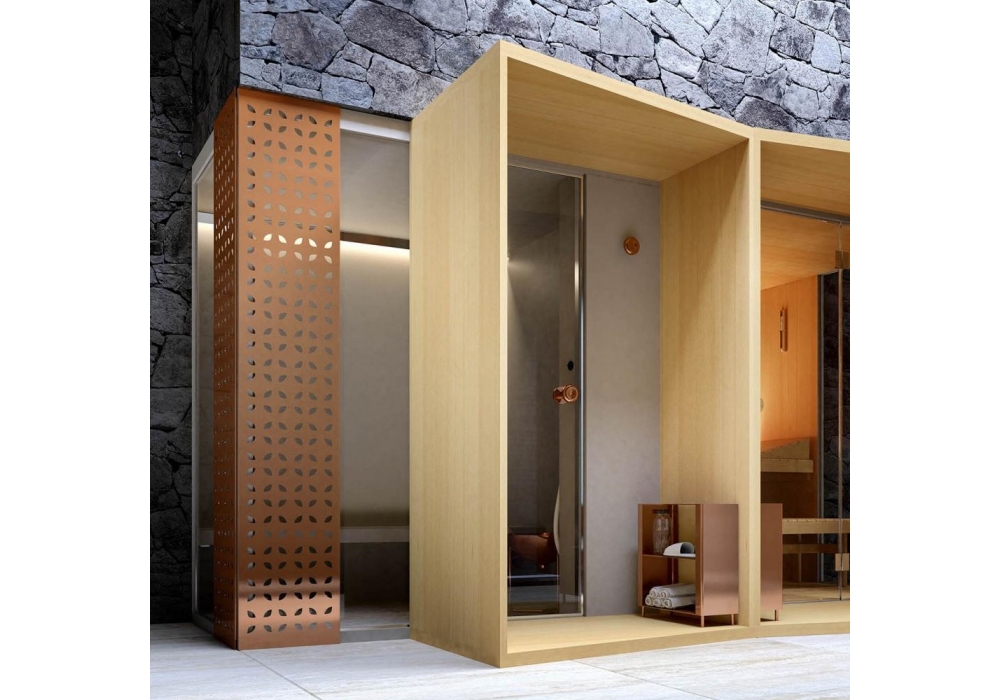 Memo Steam conçu par Luca Nichetto pour Glass1989 est un bain turc. Générateur de vapeur multi-clima pour puissances de 4 à 12 kW, tuyau kneipp, banc fixe en PlyLite, éclairage intérieur à LED, compartiment technique inspectionnable de l'extérieur, diffuseur de vapeur avec tiroir pour phytocosmétiques extractible, sonde de température, porte-peignoir extérieur. Fontaine, panneaux décoratifs, meuble, porte-peignoir, appui-tête et bancs amovibles comme accessoires.