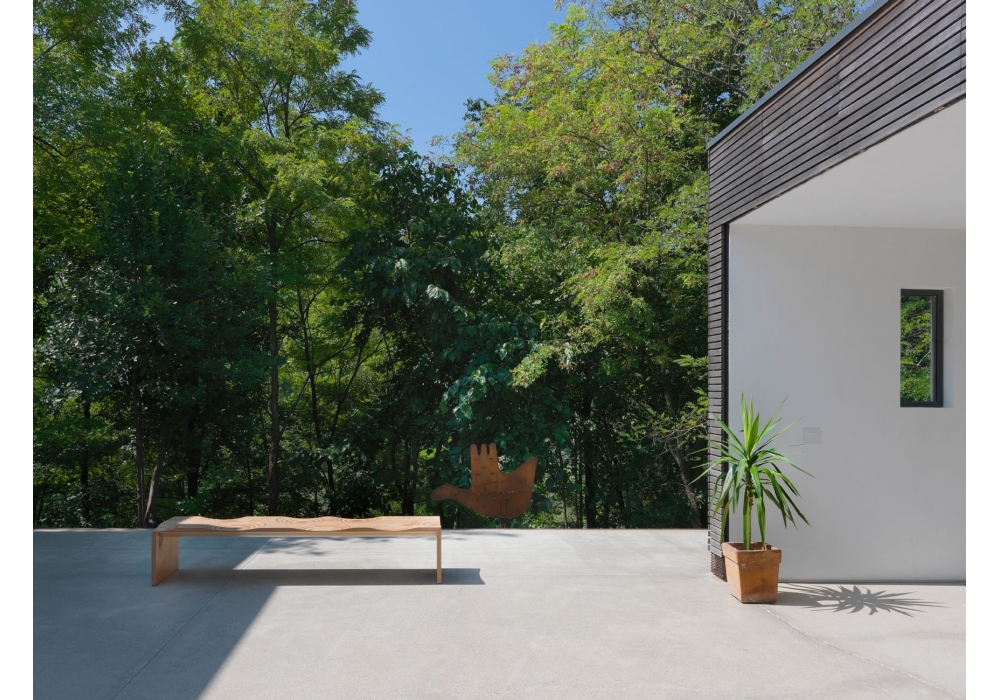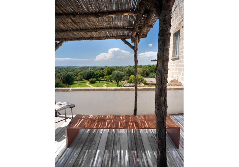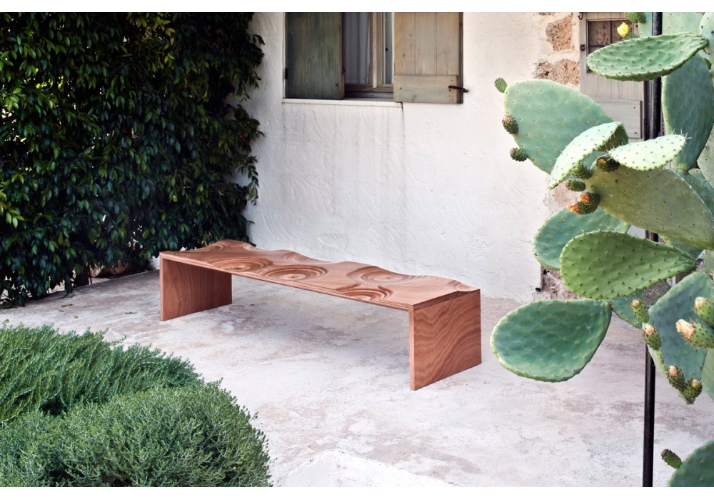 Ripples Outdoor conçu par Toyo Ito pour Casamania & Horm est un banquette en contreplaqué okumé composé de plusieurs couches superposées à grain croisé. Trou pour le drainage de l'eau présent sur trois sièges concaves internes. Assise renforcée par une barre métallique cachée.