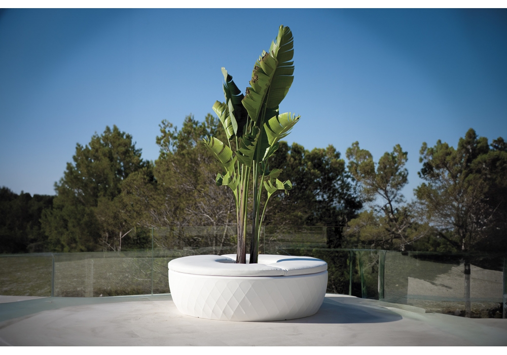Vases conçu par JM Ferrero - estudi (h) ac pour Vondom est un banc circulaire avec coussin d'assise en tissu, il est en résine de polyéthylène avec une finition mate ou laquée ou avec un éclairage LED interne. Disponible en différentes finitions.