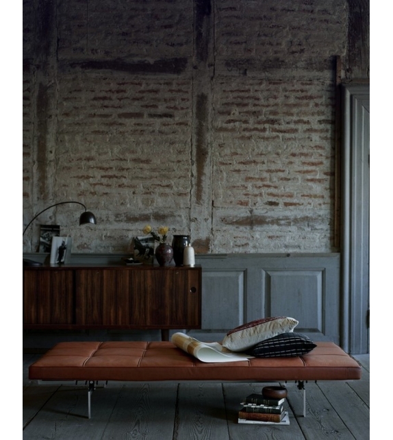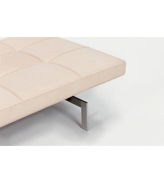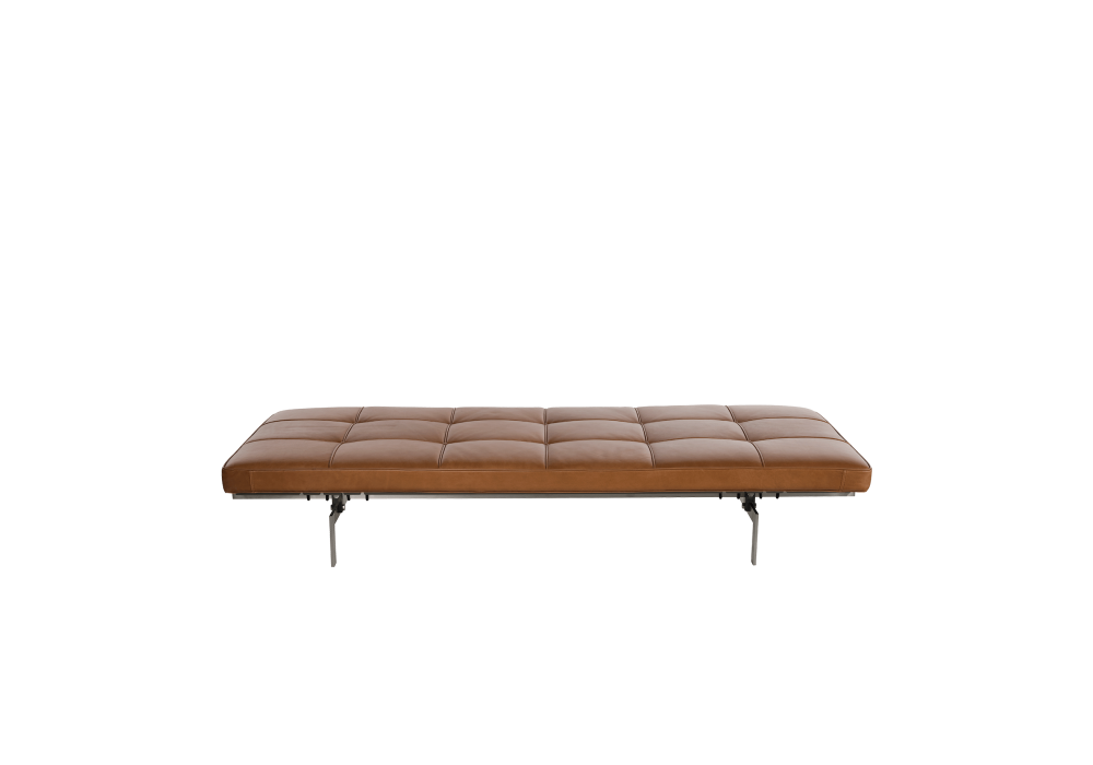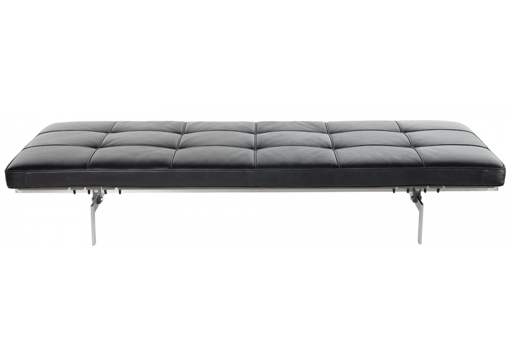 PK80 conçu par Poul Kjærholm pour Fritz Hansen est un daybed avec base en acier inoxydable satiné brossé et coussin rembourré avec revêtement en tissu ou cuir.