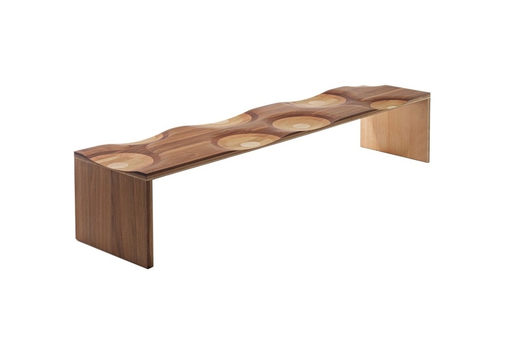 Ripples conçu par Toyo Ito pour Casamania & Horm est un banquette réalisé avec un contreplaqué spécial et exclusif de cinq types de bois différents (noyer Canaletto, acajou, cerisier, chêne et frêne). Assise renforcée par une barre métallique cachée.