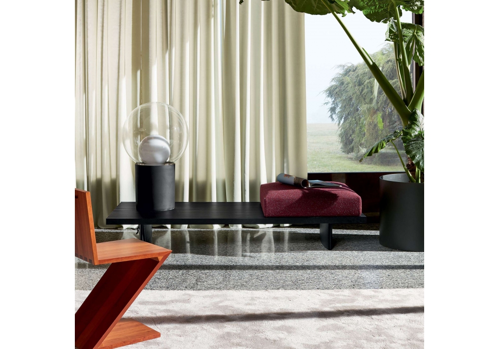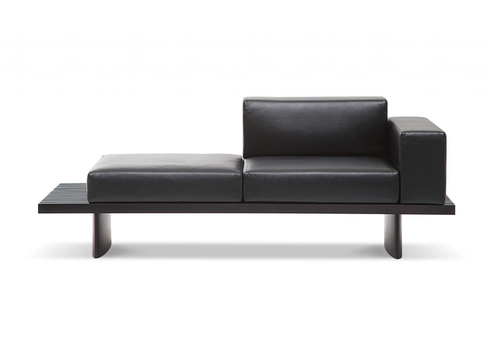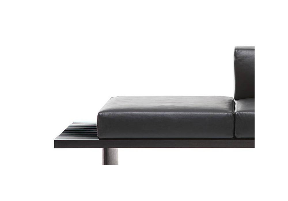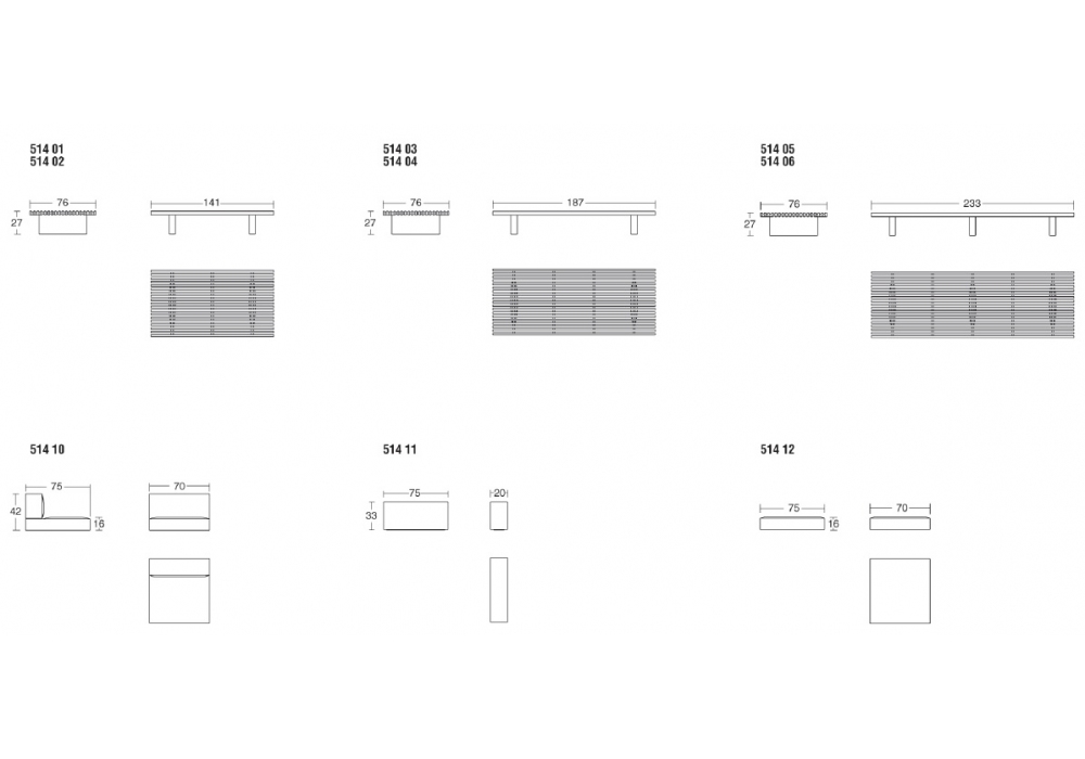 514 Refolo conçu par Charlotte Perriand pour Cassina est une système modulaire utilisable comme table basse, banc ou siège rembourré grâce à un simple ajout de coussins. La structure est en chêne naturel ou bien teinté foncé. Le plateau se compose de dixneuf lattes. Les coussins, en polyuréthane et en ouate de polyester, sont pour l’accoudoir, pour l’assise ou bien jeu de deux coussins assortis: un pour l’assise et un pour l’accoudoir. Les coussins peuvent être intégrés et fixés à la structure grâce à un système d’attache très simple.