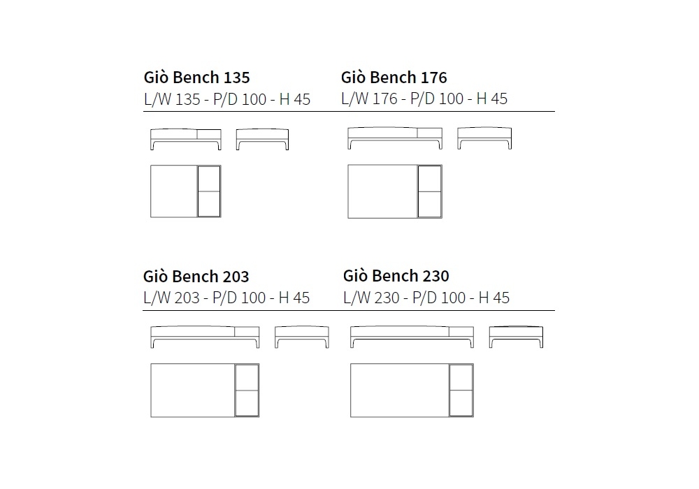 Giò conçue par Giuseppe Casarosa pour Ceccotti Collezioni est une banquette disponible en 4 différentes dimensions. Structure interne en contreplaqué et base en bois de noyer américain, siège tapissé en tissu, cuir ou cuir naturel. Patins en laiton et boîte de rangement.