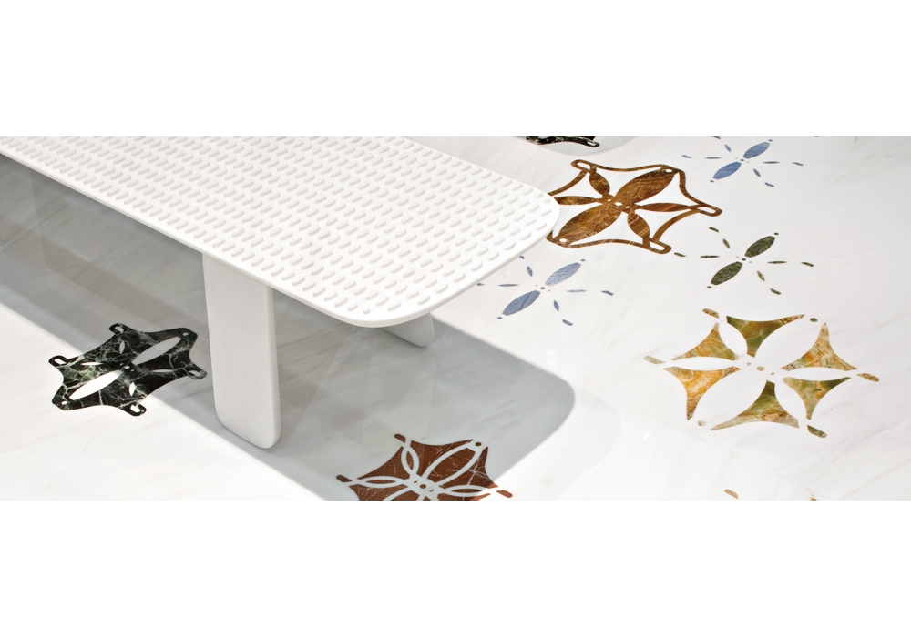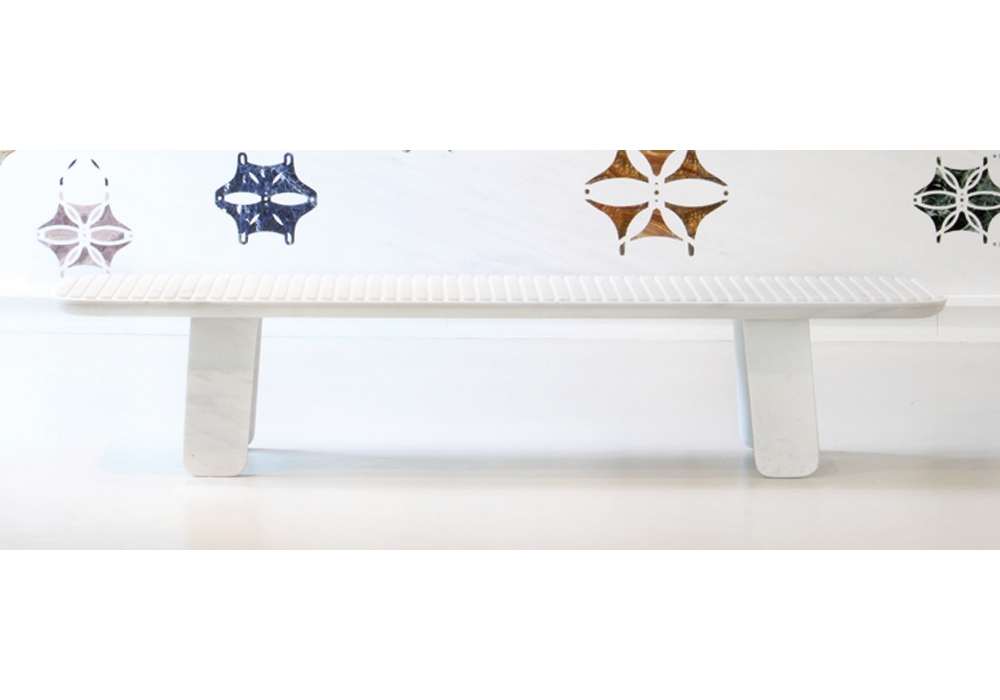 Fachiro conçue par Patricia Urquiola pour Budri est une banquette réalisée en marbre Bianco Carrara. Disponible aussi en 2 dimensions.