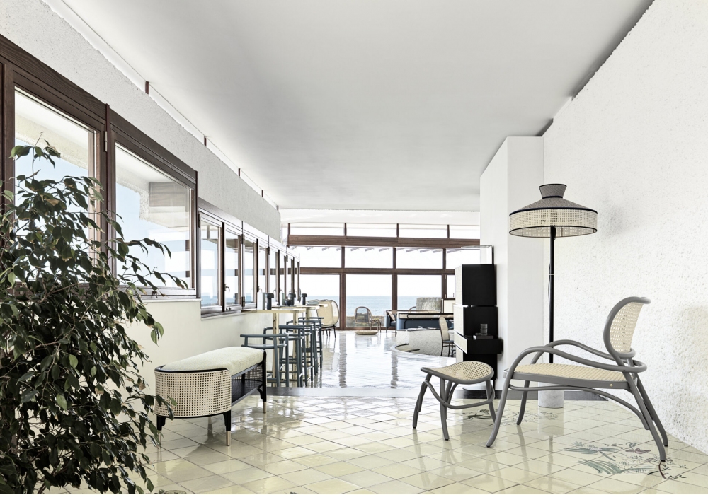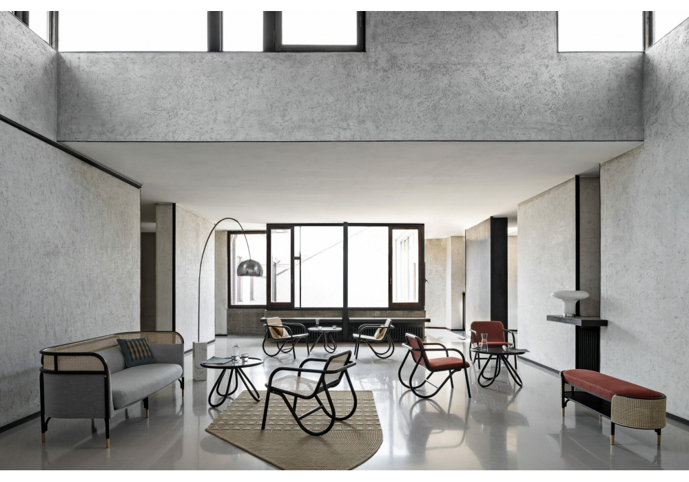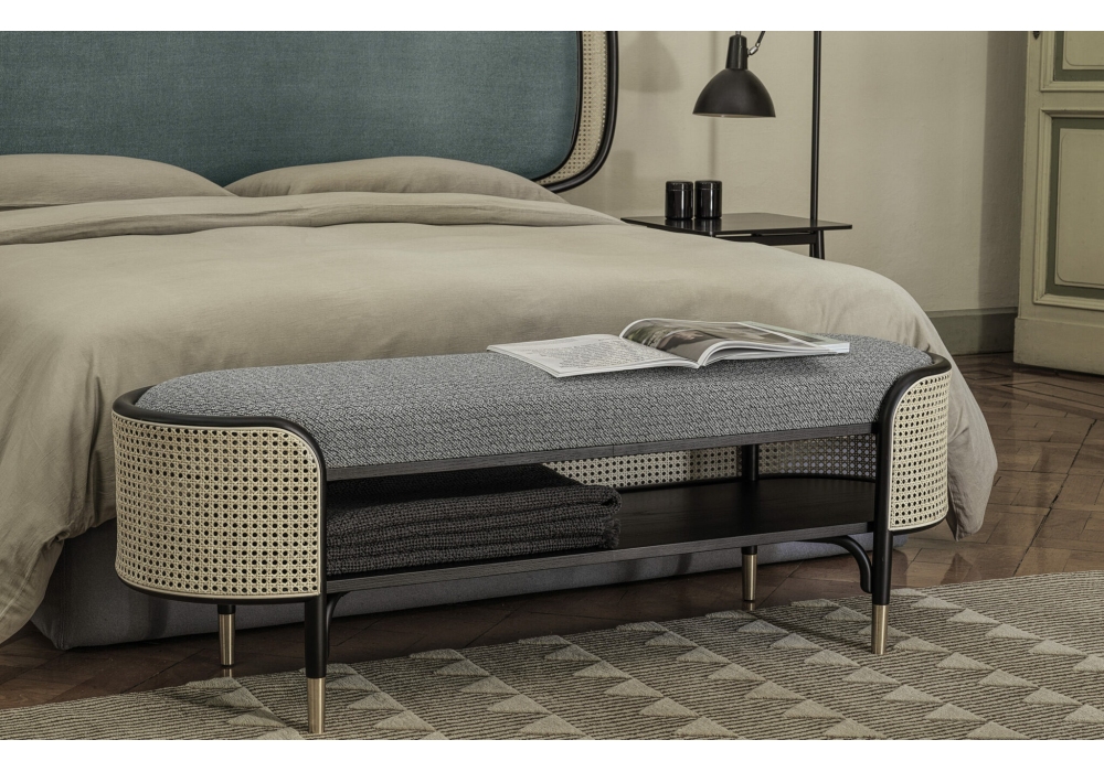 Mos conçu par GamFratesi pour Gebrüder Thonet Vienna est un banc avec structure en hêtre courbé à la vapeur et inserts en paille de Vienne. Etagères en placage de frêne vernis à pores ouverts. Siège rembourré avec revêtement amovible. Embouts en laiton. Disponible en différentes versions.