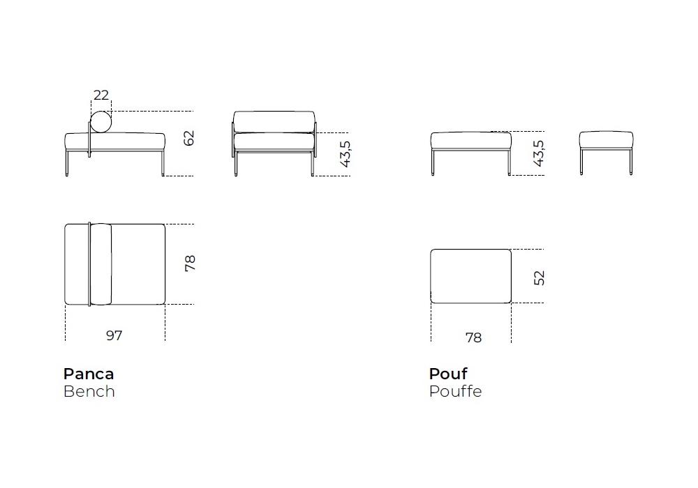 | Dimensions | 97 x 78 x H 62 cm; 78 x 52 x H 43,5 cm (Pouf). |
