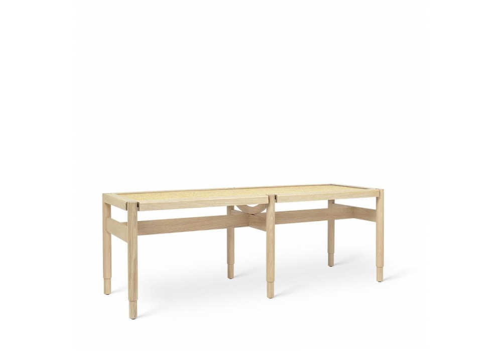 Winston conçu par Eva Harlou pour Mater est un banc avec une structure en bois de chêne laqué mat, certifié FSC, sur laquelle est appliqué le siège en paille de vienne.