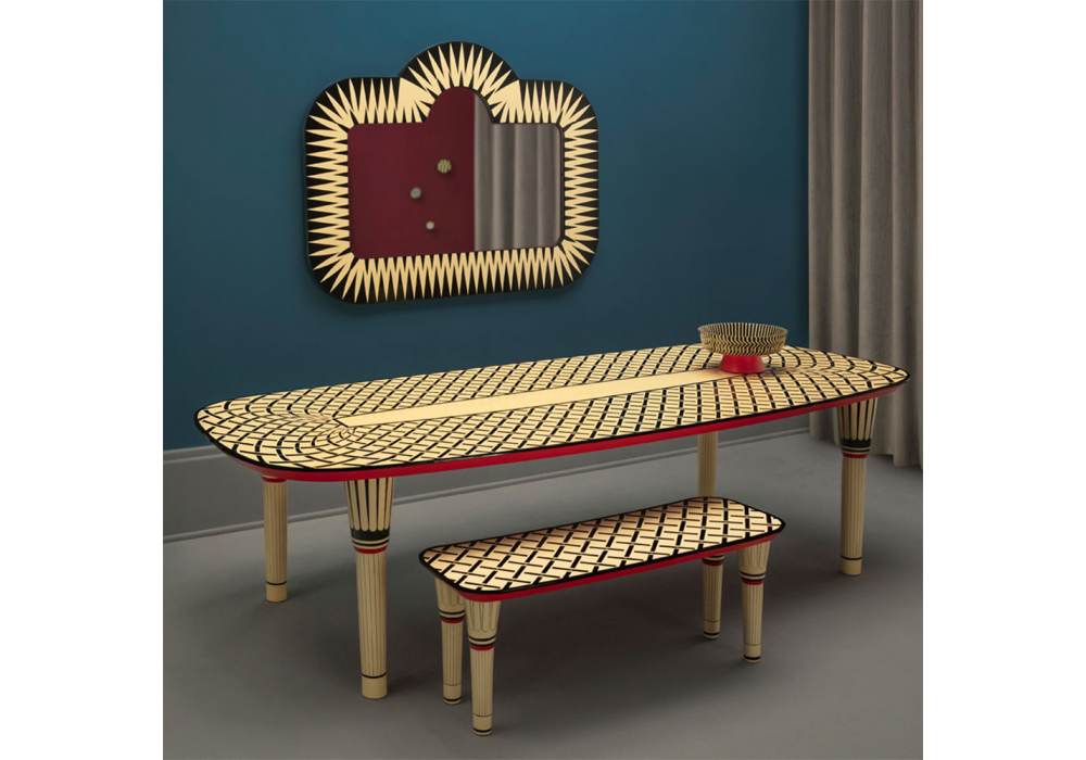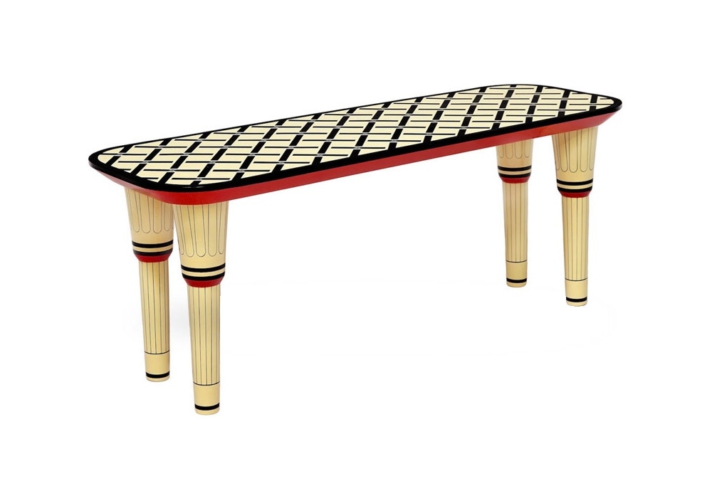 Easy Street conçue par Matteo Cibic pour Scarlet Splendour est une banquette en MDF, bois, incrustation de résine et support métallique.