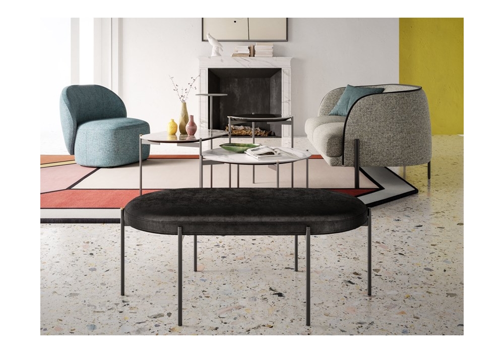 Caillou conçu par Liu Jo Living Collection est un banc. Le cadre est réalisé en multiplis de bois. Le pied en métal est disponible en quatre couleurs. Le revêtement est disponible en tissu ou en cuir.