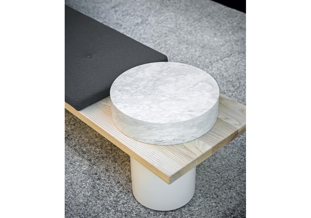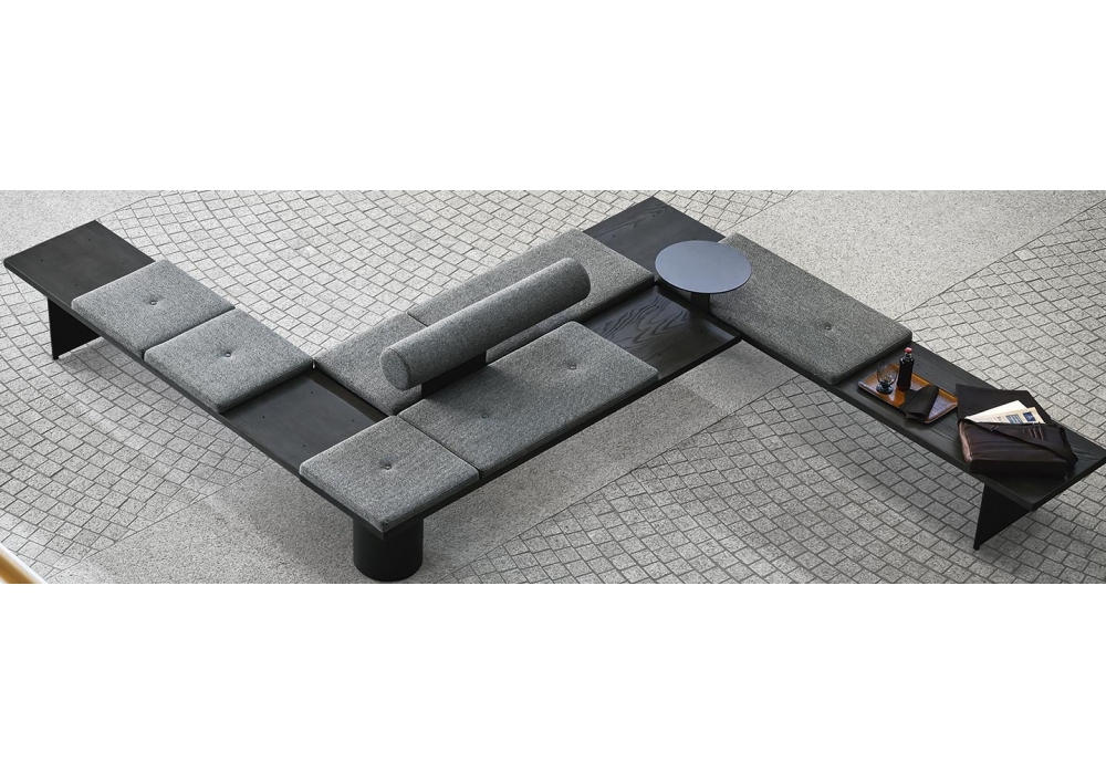 Galleria conçu par Pearson Lloyd pour Tacchini est un système modulaire avec structure en frêne qui permet de créer différentes solutions : banc linéaire, double siège d'angle, îlot. La base est une poutre en acier disponible en différentes compositions et tailles, sur laquelle sont fixés des coussins d'assise avec des revêtements non amovibles. Il est possible d'ajouter des accessoires tels que des tables basses dans différents matériaux et un coussin lombaire.
