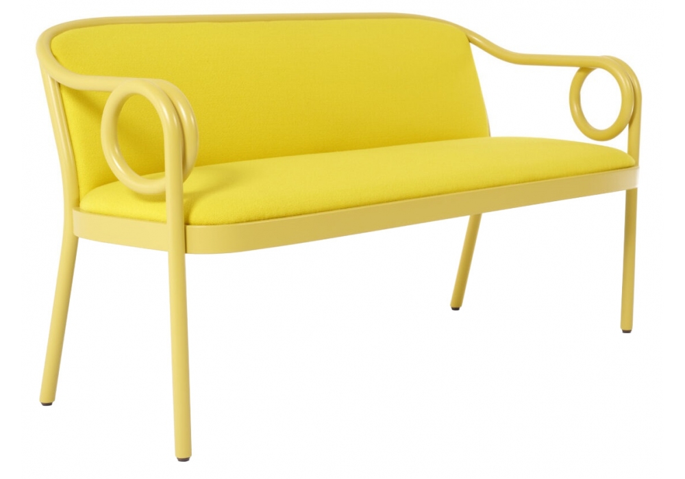 Loop conçue par India Mahdavi pour Gebrüder Thonet Vienna est une banquette avec structure en hêtre courbé, assise et dossier rembourrés avec revêtement en tissu ou cuir. Disponible en différentes finitions.