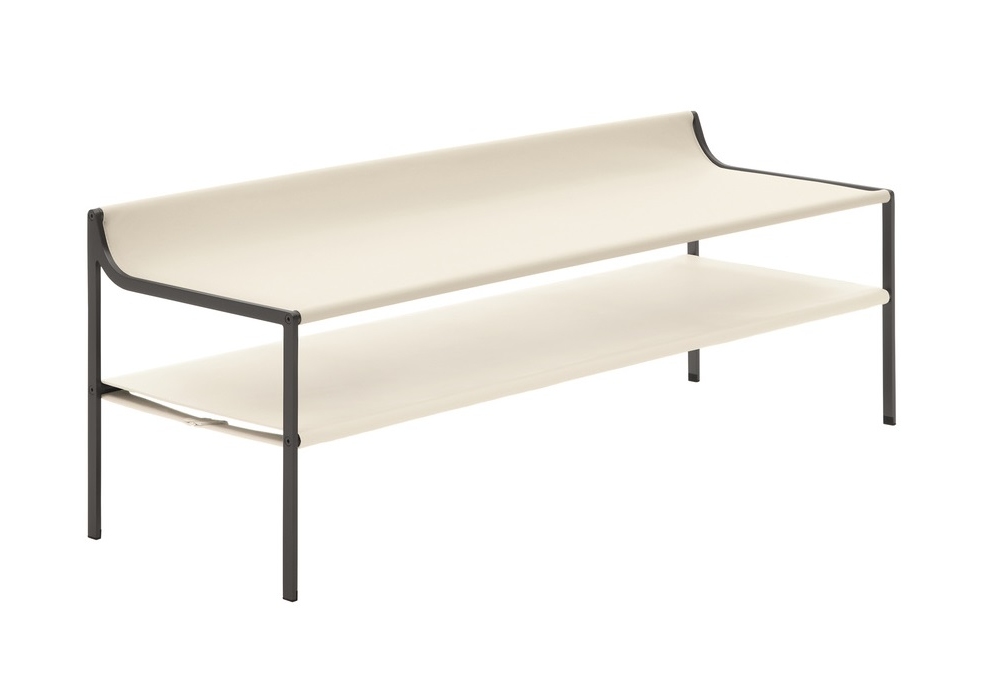 Quiet Lines conçu par Gabriel Tan pour B&B Italia est un banc réalisé avec une structure en acier peint et des inserts en cuir. Disponible en différentes finitions.