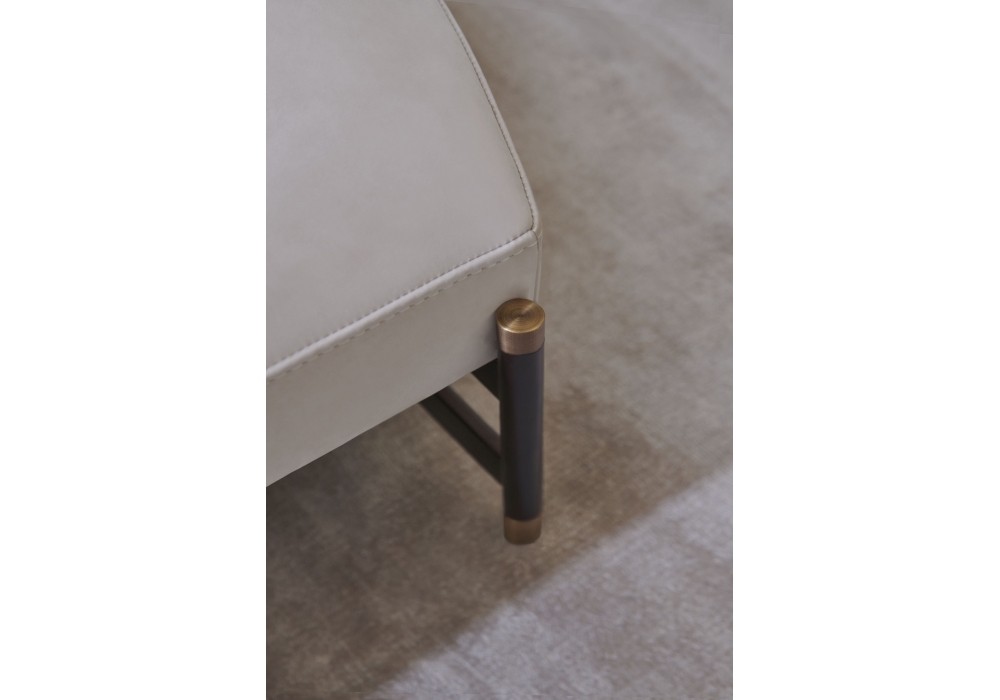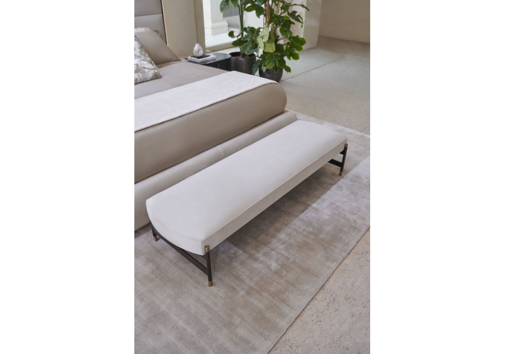 Iron conçue par Joe Garzone pour Conte Casa est une banquette réalisée avec un revêtement en tissu ou en cuir et une structure en métal peint en bronze avec des détails en laiton bruni.