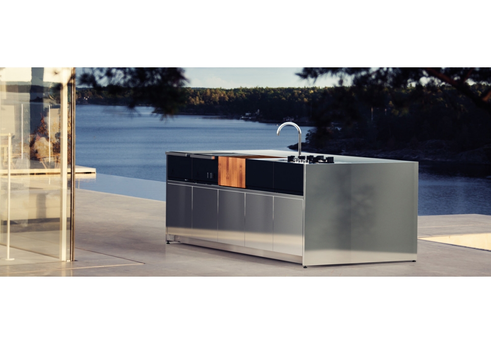 Kitchen Island conçue par Broberg & Ridderstråle pour Röshults est une cuisine modulaire d'extérieur réalisée en acier inoxydable.