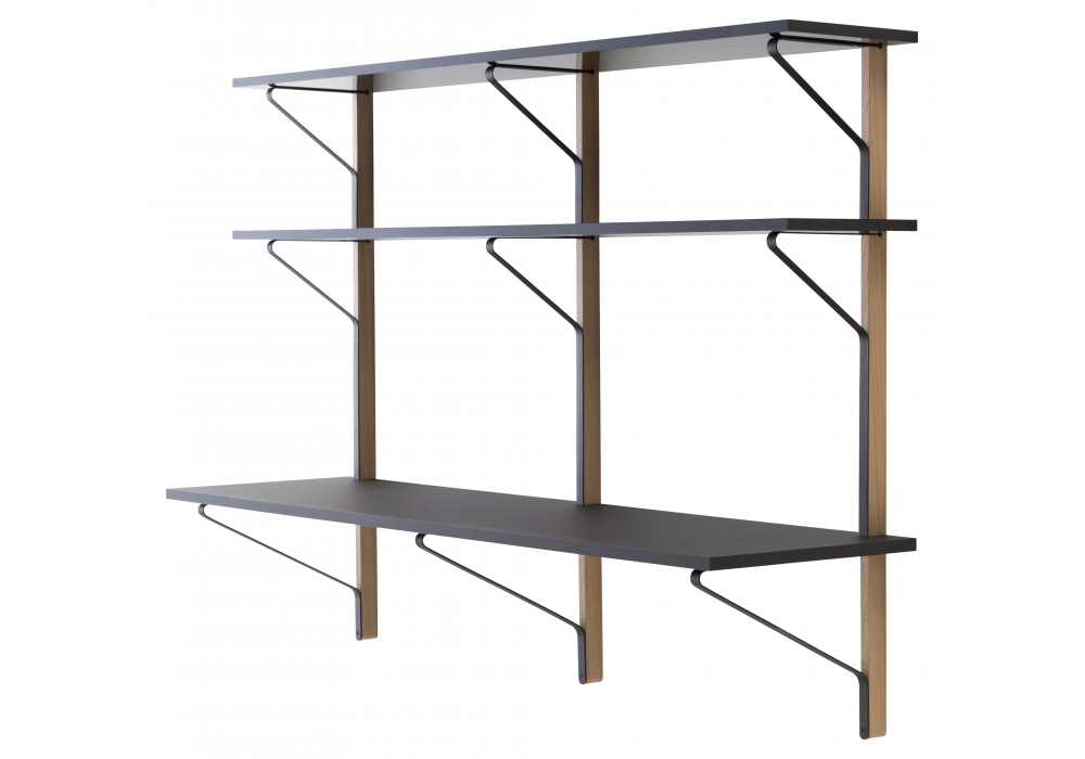 L'étagère Kaari avec bureau, conçue par Ronan & Erwan Bouroullec pour Artek, fait partie de la collection Kaari. Étagères avec surface mélaminé / linoléum, supports muraux en chêne naturel massif avec vernis protecteur, acier laminé plat laqué par poudre noir.