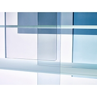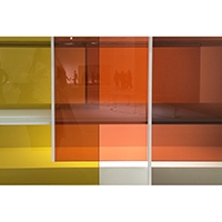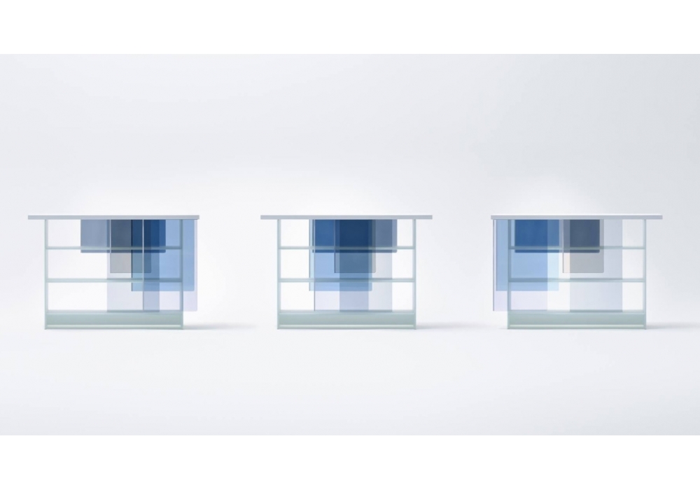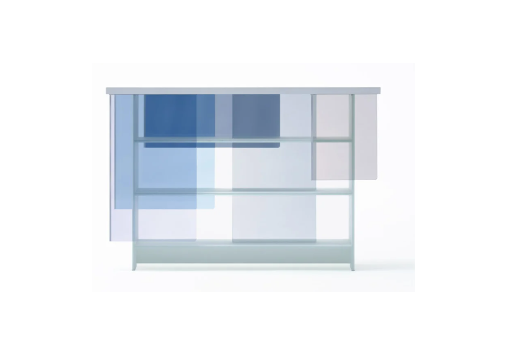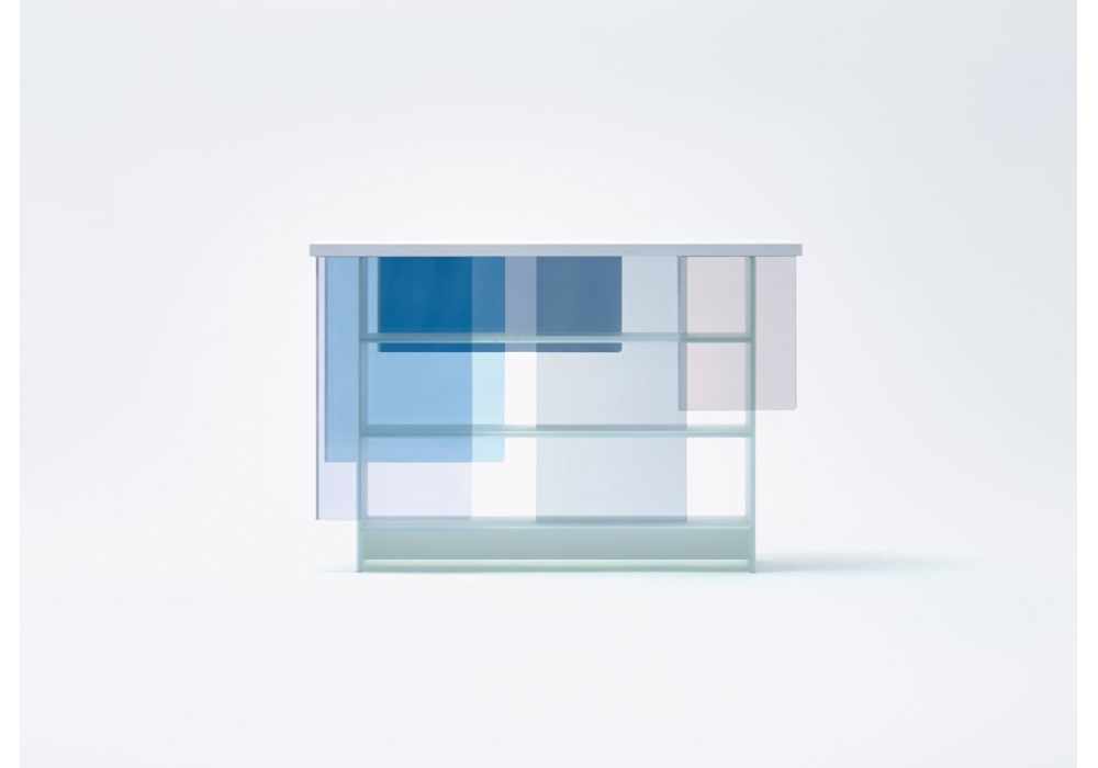 Layers designed by Nendo for Glas Italia is a bookcase realized in extralight matt white crystal. This coloured glass technique which involves inserting coloured films between two sheets of glass, and applying heat to them is the expertise of Glas Italia. he doors are available in two tone of colours: warm (orange, red, brown) and cool (light blue, grey, violet).