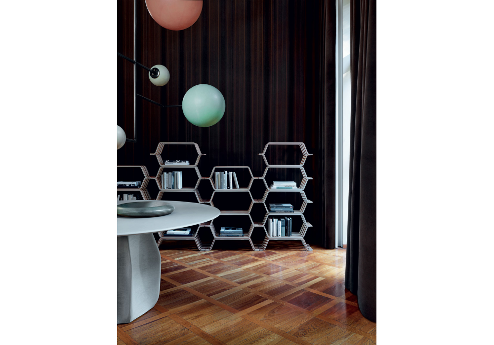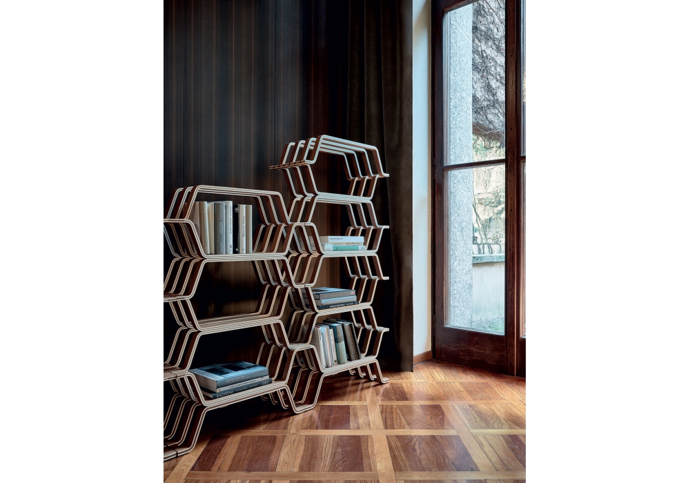 MHC.2 conçue par Yasuhiko Itoh pour Molteni&C est une bibliothèque entièrement en bois courbé recouvert de noyer canaletto. MHC.2 est disponible en deux hauteurs. Reproduction selon le prototype original de 1959.