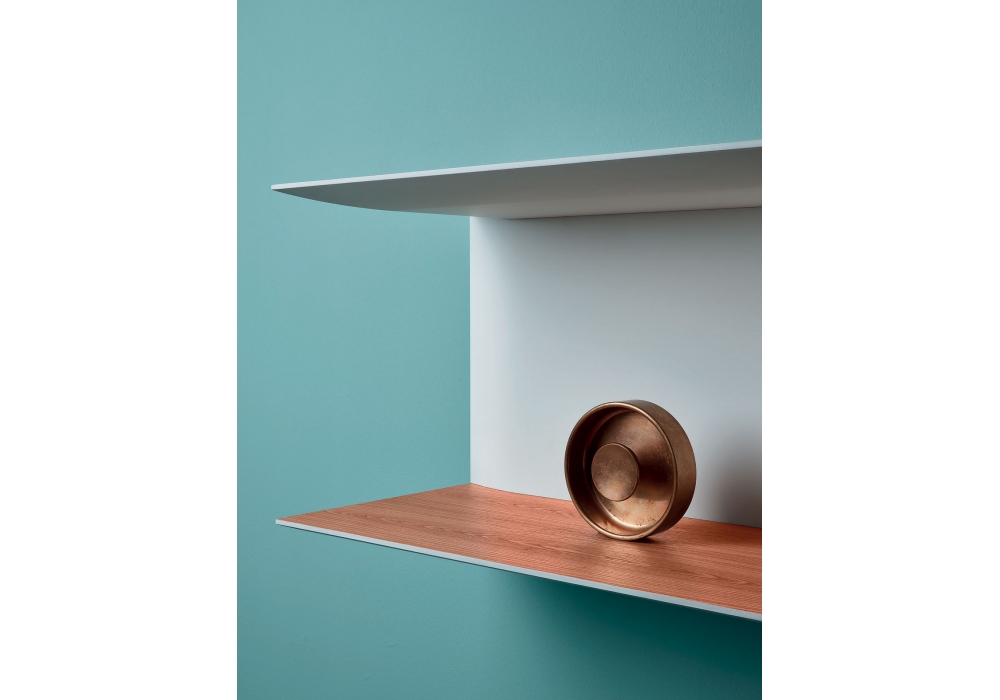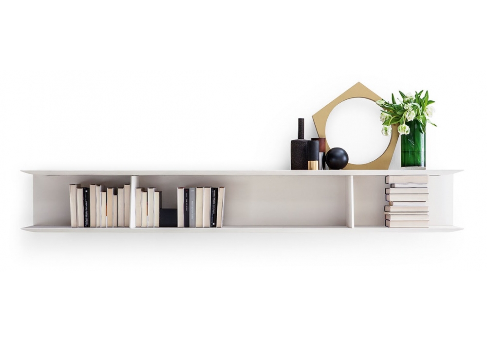 D.355.1 - D.355.2 conçue par Gio Ponti pour Molteni&C est une bibliothèque suspendue en contreplaqué façonné recouvert d'orme, en partie avec une finition transparente naturelle, en partie peinte à la main en blanc. Disponible en différentes dimensions.
