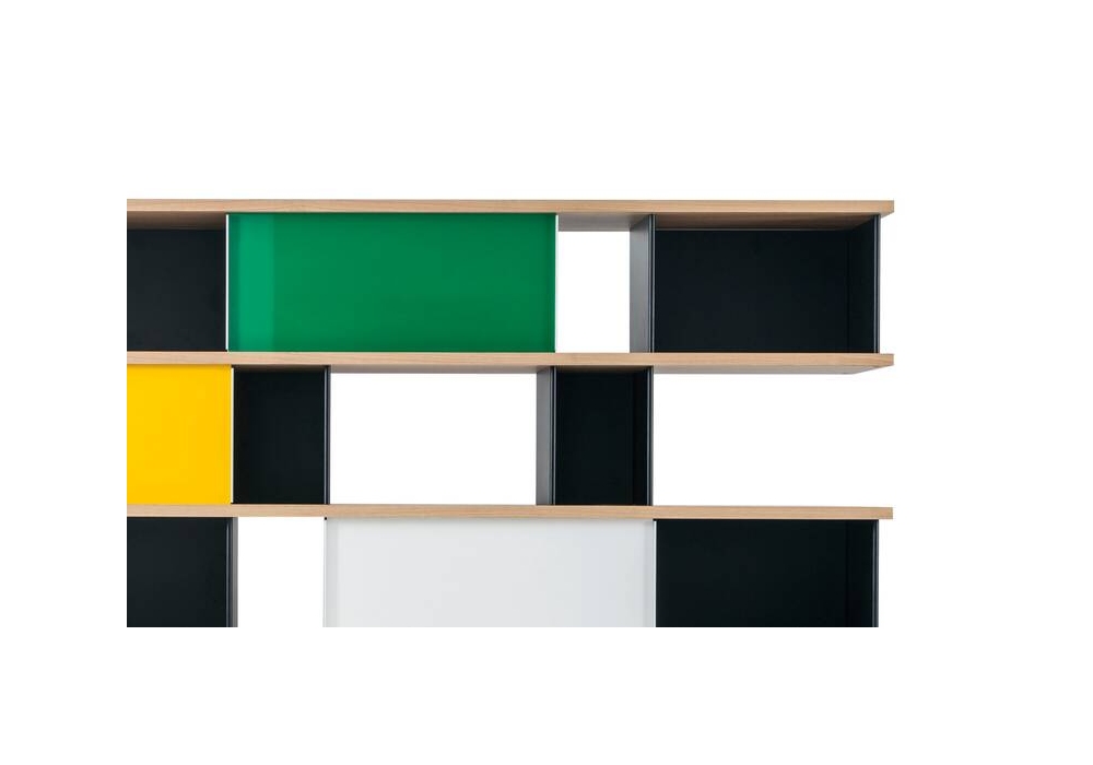 526 Nuage conçu par Charlotte Perriand pour Cassina est un système de bibliothèques avec étagères en bois de chêne et éléments verticaux en aluminium anodisé ou peint. Contactez le service client pour les finitions peintes.