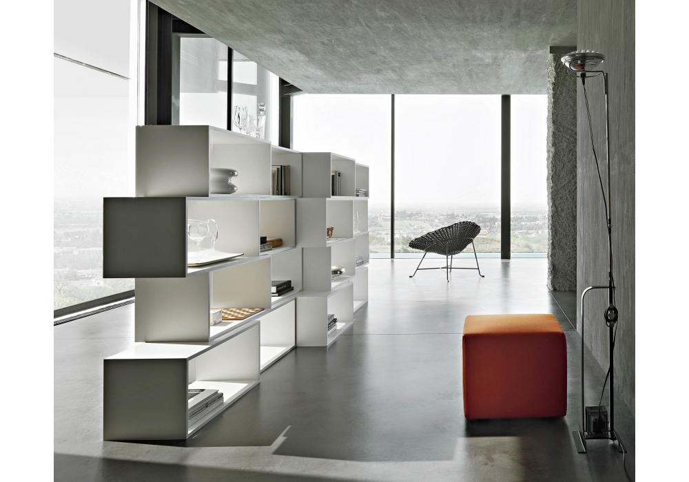 ZigZag conçu par Studio Nendo pour Lema est une une bibliothèque en mélamine blanche.