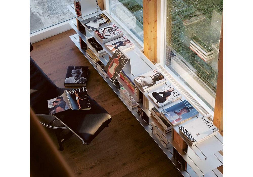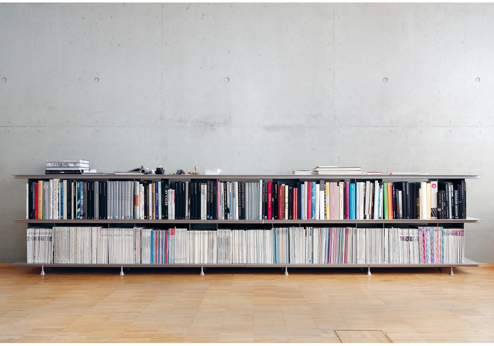 Zoll D conçue par Lukas Buol & Marco Zünd pour Moormann est une bibliothèque modulaire au design minimaliste et fonctionnel en aluminium anodisé argent. Disponible en différents modèles.