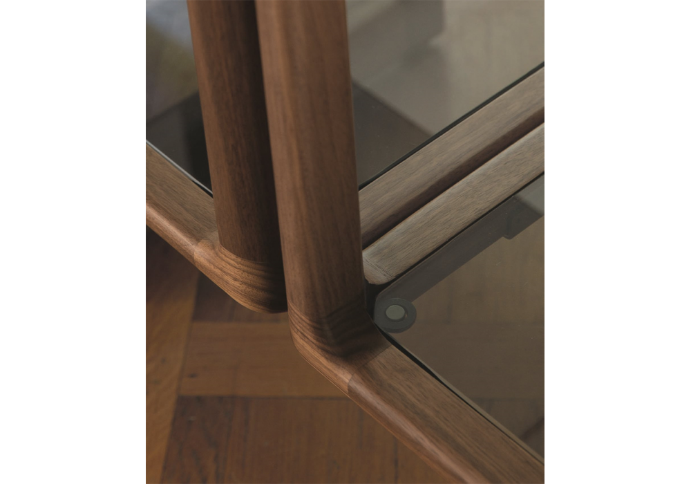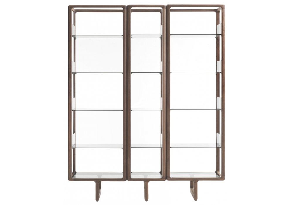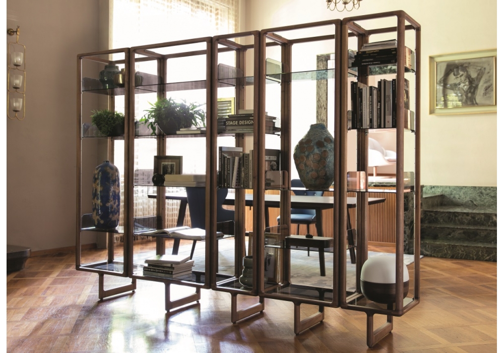Myria conçue par D. Dolcini pour Porada est une bibliothèque en noyer canaletta massif avec étagères en verre fumé trempé. Si utilisée seule, la structure doit être liée au mur, tandis que en composition on peut l’utiliser comme cloison. Eléments d’assemblage ou fixation au mur en cuivre bronzé brossé.