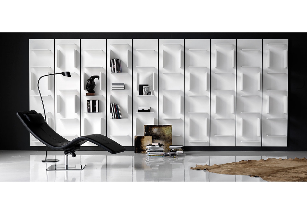 Fifty conçue par Luigi Trenti pour Cattelan Italia est une bibliothèque murale modulable en bois laqué gaufré disponible en finitions blanc ou bronze. Fournie avec fixation haut/bas.