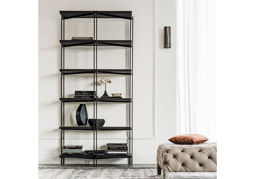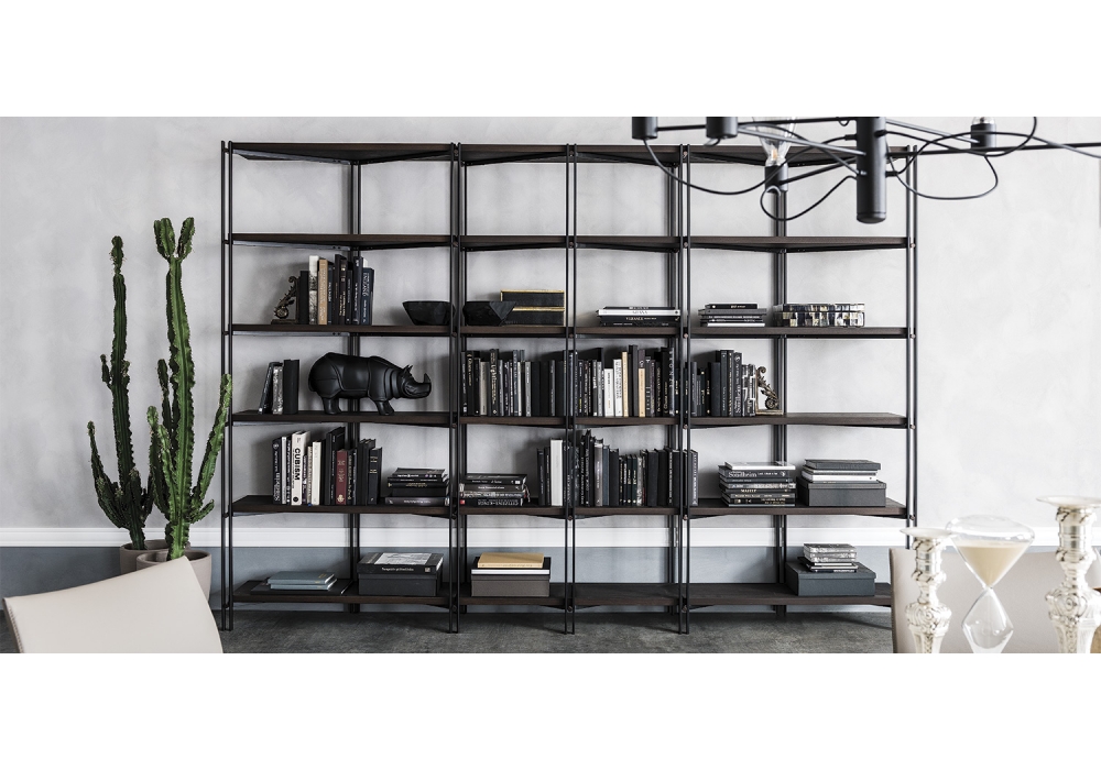 Hudson conçue par Giorgio Cattelan pour Cattelan Italia est une bibliothèque modulaire avec structure réalisée en acier gaufré blanc, noir, titane ou graphite. Étagères en bois noyer Canaletto, chêne brûlé, gaufré blanc ou graphite. Détails en acier laqué bronze satiné.